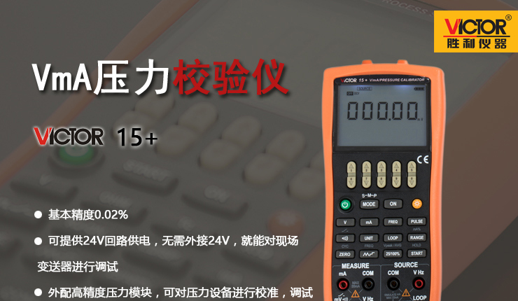 VICTOR 15+ VmA壓力校驗儀是一款0.02%精度的高性能過程校驗儀,具有模擬輸出直流電壓、直流電流、模擬變送器、頻率、脈沖個數(shù)等功能,同時具備測量直流電壓、直流電流、頻率、通斷測試以及壓力測量等功能;該儀表開放通訊協(xié)議,便于二次開發(fā)。