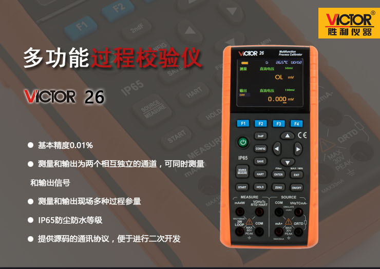VICTOR 26多功能過程校驗儀具有高精度測量和輸出現(xiàn)場所需的各種過程參量,適用于現(xiàn)場溫度變送器、壓力變送器、DCS、PLC等系統(tǒng)的調(diào)試和校準(zhǔn),并在石油化工、生物制藥、工業(yè)自動化、大專院校和科研機(jī)構(gòu)等領(lǐng)域的得到了廣泛的應(yīng)用。
