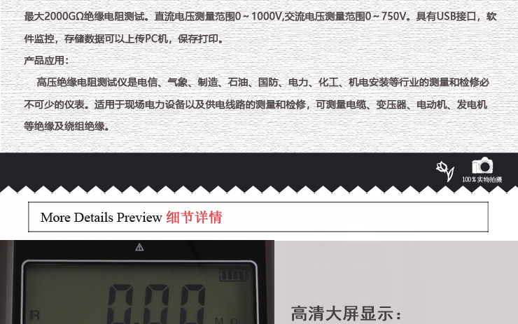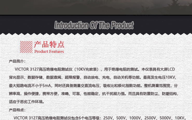 VICTOR 3127 高壓絕緣電阻測試儀包含6個電壓等級:250V、500V、1000V、2500V、5000V、10KV。最大2000GΩ絕緣電阻測試。直流電壓測量范圍0~1000V,交流電壓測量范圍0~750V。具有USB接口,軟件監控,存儲數據可以上傳PC機,保存打印。