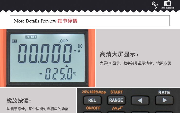 * 輸出直流電流時,可同時顯示mA和%值;25%和100%的手動步進、自動步進及自動斜坡的電流輸出功能。