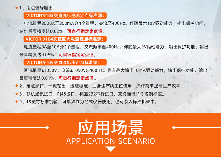 VICTOR 910x系列交直流電壓/電流標準源(以下簡稱標準源)是6位輸出值顯示,定點輸出交直流電壓/電流的標準源。采用數(shù)字式信號合成技術(shù)和先進的穩(wěn)幅、功放、保護新技術(shù),使其穩(wěn)定性好、精度高、安全可靠。通過按鍵選擇,直接輸出一個固定值,輸出快速方便。具有以太網(wǎng)RJ45接口、標準RS232通訊接口,軟件協(xié)議簡單,便于組成系統(tǒng)。