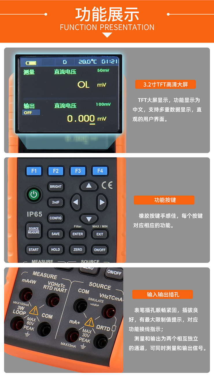 1. 多功能、高精度、高穩(wěn)定度的現場過程校驗器,提供強大的測量和輸出功能以及特殊功能,幾乎滿足過程控制現場所有的校驗工作。