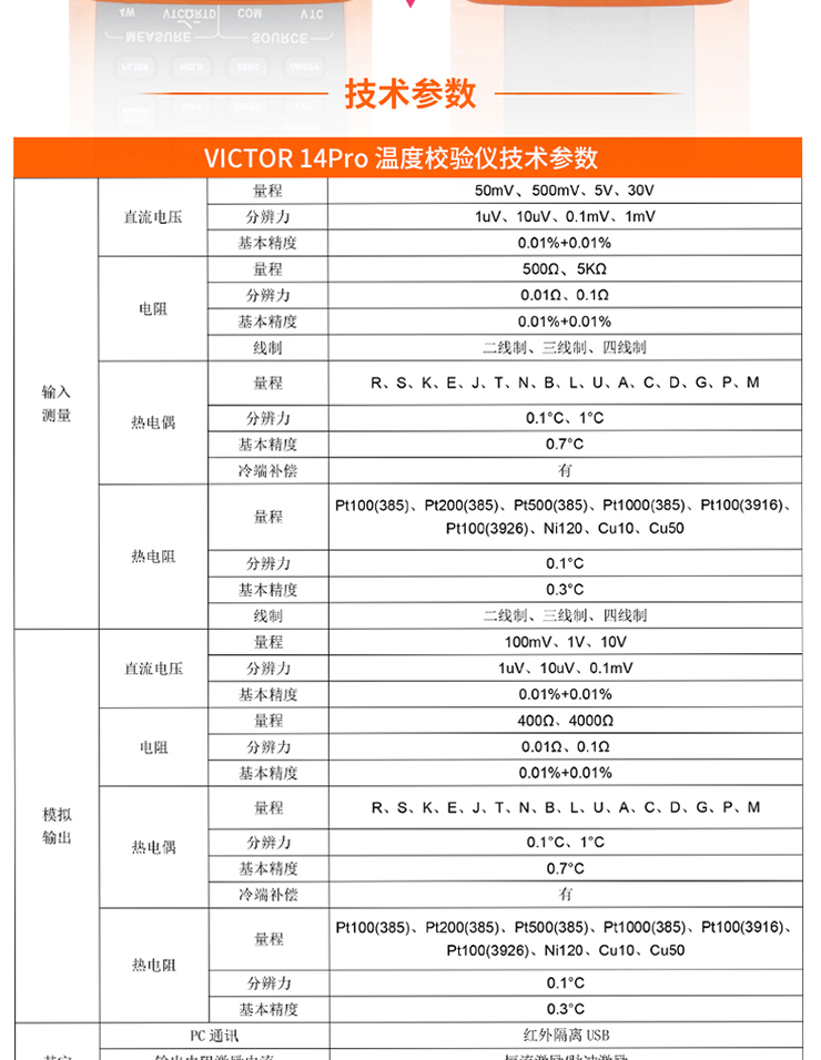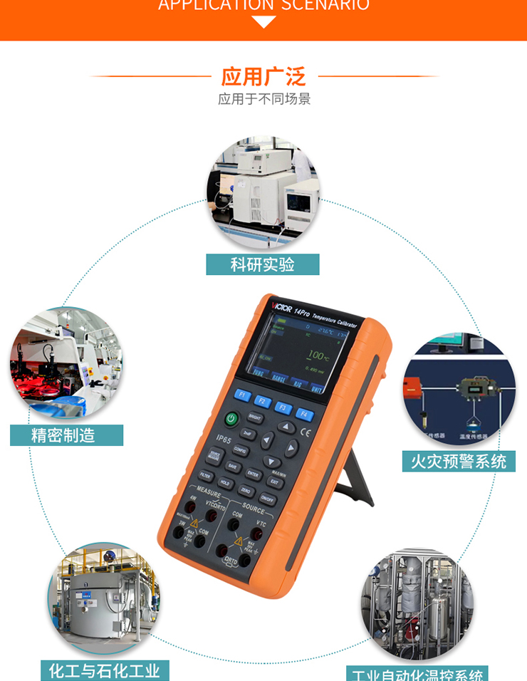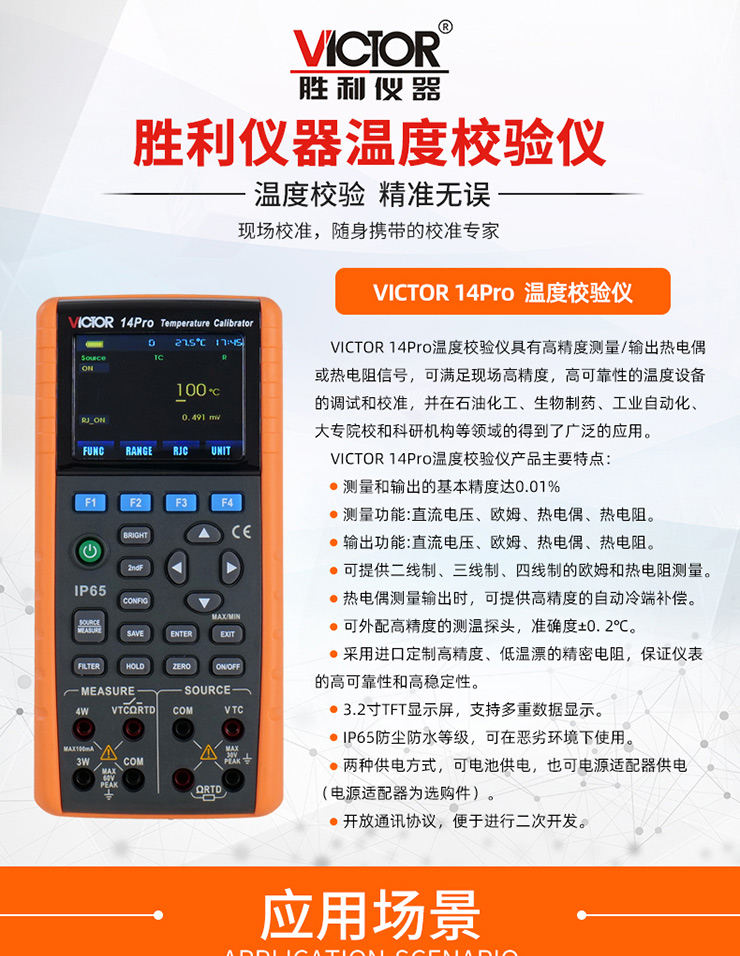 VICTOR 14Pro 溫度校驗儀具有高精度測量/輸出熱電偶或熱電阻信號,可滿足現場高精度,高可靠性的溫度設備的調試和校準,并在石油化工、生物制藥、工業自動化、大專院校和科研機構等領域的得到了廣泛的應用。