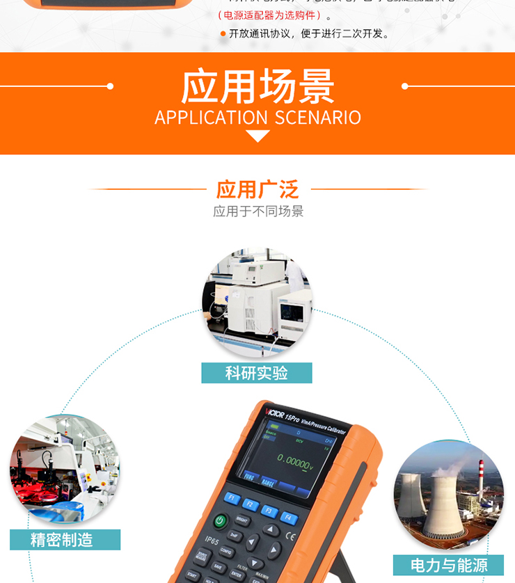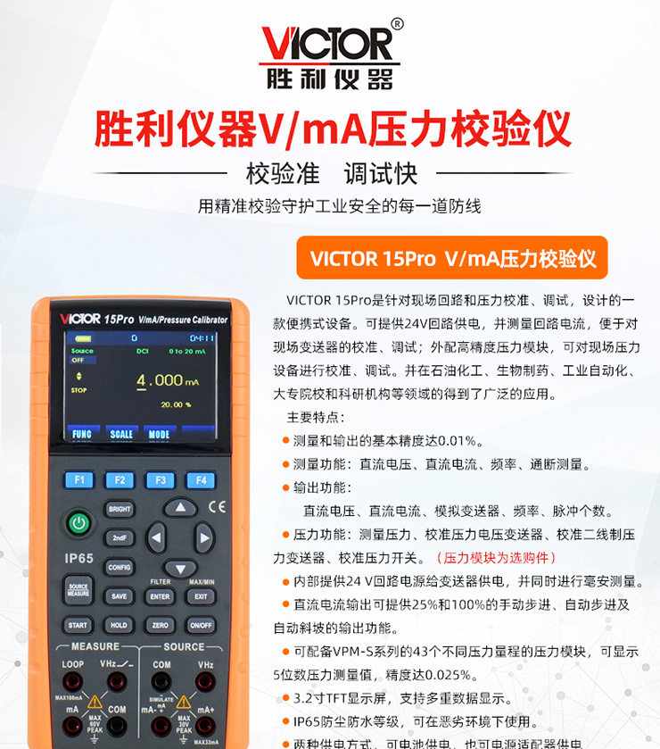 VICTOR 15Pro VmA壓力校驗儀是一款0.02%精度的高性能過程校驗儀,具有模擬輸出直流電壓、直流電流、模擬變送器、頻率、脈沖個數等功能,同時具備測量直流電壓、直流電流、頻率、通斷測試以及壓力測量等功能;該儀表開放通訊協議,便于二次開發。